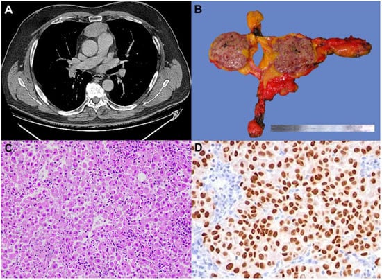 The second patient was a 62-year-old man with a history of skin melanoma of the cervical region which had been surgically resected in 2016. The pathological stage was pT2a, and the tumor harbored the BRAF V600E mutation. One year later a distant relapse to the right foot occurred and was treated with radiotherapy and immunotherapy. After almost five years of controlled disease, a total body CT scan revealed a retrosternal well-defined mediastinal mass of 27 × 30 × 44 mm (Figure 2A), hypermetabolic (SUV = 11.8) at 18-FDG-PET/CT scan. The case was discussed in a multidisciplinary setting; considering the unique localization without metastases in other sites and the radiological features of the mass, a surgical approach was proposed because a primitive neoplasm of the thymus was suspected. A standard robotic-assisted thymectomy was performed. Gross examination showed a brownish nodular mass (Figure 2B). At histology, the tumor was composed of irregularly shaped and eosinophilic neoplastic cells, strongly and diffusely immunoreactive for melanocytic markers (SOX10, Melan A, S100, HMB45). Based on histological and immunohistochemical examination, the diagnosis of intrathymic metastasis of melanoma was made (Figure 2C,D). A large panel of NGS was carried out to identify rare mutations or co-mutations that may have occurred. The tumor showed BRAF mutation (V600E) as the primitive melanoma. No additional mutation has been reported. After surgery, the patient started adjuvant treatment with Nivolumab at a dosage of 480 mg every 4 weeks. Currently, the patient has completed eight cycles of treatment with no reported toxicities. One year after surgery, the patient remains under follow-up and is in good health.