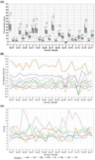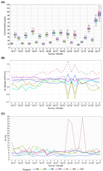 The CVs of the manufacturer collectives are predominantly low for all EQA samples (Figure 1C). With the exception of the DG sub-collective, the CVs of all collectives remained below 10% for both samples over the thirteen EQAs. The AB and RO collective did not exceed a maximum CV of 6%. The DG sub-collective showed increased CVs of over 10% and up to 14% several times. In this EQA survey, the SI sub-collective DG showed noticeable higher values for CEA than the others (Figure S1).