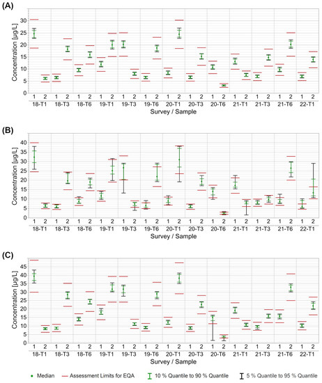 In this study, the CEA and AFP results were analyzed for the EQA surveys 2018-T1 to 2022-T1. Due to the large number of EQA surveys, only the data from the three annual EQAs with the largest number of participants (T1 (January), T3 (May), and T6 (October)) were evaluated (Table S1). Thus, a total of thirteen CEA and AFP surveys were analyzed. Results from individual participants that involved sample mix-ups or reporting errors were excluded from the analysis. This applied to 15 results for CEA and AFP, respectively.