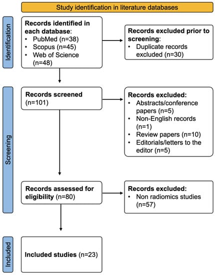 After excluding duplicate entries (n = 30), 101 records from all three databases were screened. A total of 21 studies were excluded due to being an inappropriate manuscript type (non-English, review, conference paper, and editorial/letter to the editor), and 57 studies were excluded because of a non-radiomics study design (studies that did not extract radiomics features). This yielded a final sum of n = 23 manuscripts, which were included for analysis (Figure 1).