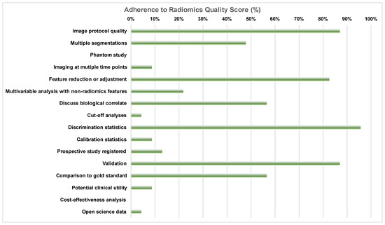 Adherence to RQS items varied significantly. As shown in Figure 2, 96% of manuscripts contained some discrimination statistics (e.g., AUC with 95% confidence intervals), and more than 85% (87%) of papers included a sufficiently detailed imaging protocol. It is important that 13% of the studies did not attempt any validation (including internal testing). In contrast, only 9% of the studies included calibration statistics for the presented machine learning models. Feature reduction to account for the possibility of overfitting was performed in 83% of manuscripts, and 57% of studies established the ground truth with the use of a gold standard (e.g., bone marrow biopsy). Finally, only 4% of manuscripts provided either an open access code or open access data, whereas no manuscript included a cost-effectiveness analysis or phantom standardization of radiomics features.