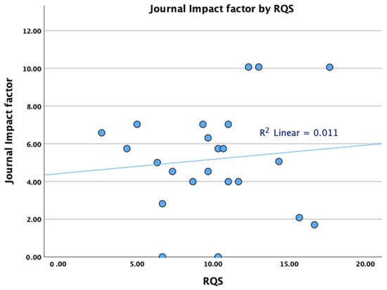 Scatter plot demonstrating the relationship between journal impact factors and radiomics quality scores.