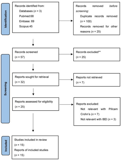 - Tamilarasan, A.G.; Tran, Y.; Paramsothy, S.; Leong, R. The diagnostic yield of pan-enteric capsule endoscopy in inflammatory bowel disease: A systematic review and meta-analysis. J. Gastroenterol. Hepatol. 2022, 37, 2207–2216. [Google Scholar] [CrossRef] [PubMed]