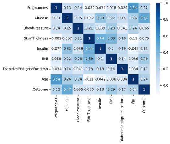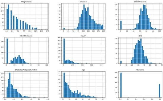 The Diabetes Dataset, denoted by D1 and available on Kaggle [], contains data collected from 768 female patients of Pima Indian heritage residing in Arizona, USA. The dataset includes eight features or variables, including age, number of pregnancies, glucose level, insulin level, blood pressure, body mass index (BMI), diabetes pedigree function, and an outcome variable indicating whether or not the patient has diabetes. Age is a continuous variable representing the age of the patient in years. The number of pregnancies is an integer variable indicating the number of times the patient has been pregnant. Glucose level is a continuous variable representing the 2-h plasma glucose concentration in the patient’s blood. Insulin level is a continuous variable representing the serum insulin level in the patient’s blood. Blood pressure is a continuous variable representing the patient’s diastolic blood pressure in mm Hg. BMI is a continuous variable representing the body mass index of the patient. Diabetes pedigree function is a continuous variable representing the diabetes pedigree function for the patient, which provides information about the patient’s genetic predisposition for diabetes. Finally, the outcome variable is a binary variable indicating whether or not the patient has diabetes, with 1 representing the presence of diabetes and 0 representing the absence of diabetes. The Diabetes Dataset is a valuable resource for researchers and healthcare professionals interested in studying the risk factors associated with diabetes and developing better ways to prevent, manage, and treat the disease. By analyzing the relationships between these features and the outcome variable, researchers can identify important risk factors for diabetes and develop effective interventions and treatments to improve patient outcomes. The correlation among the features of the dataset is depicted in Figure 2, and the histogram of each feature vector is shown in the plots of Figure 3.