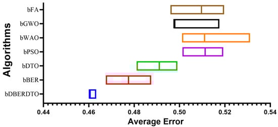 In Figure 4, the proposed method, bDBERDTO, has the lowest average error in a plot comparing the average errors achieved by other feature selection techniques. The plot also included the other methods bFA, bGWO, bWOA, bPSO, bDTO, and bBER, but none of them could match the performance of bDBERDTO. The plot shows that the proposed method is quite good at picking out the most important features in a dataset, which improves the overall performance of the system. It’s important to remember that even the other methods managed to attain low average mistakes, showing that they are not without merit. However, the recommended strategy emerges as the undisputed victor in this comparison. The ramifications of these findings for professionals in domains that use feature selection techniques to boost model performance are substantial. Compared to popular feature selection approaches, bDBERDTO is expected to produce even better outcomes.