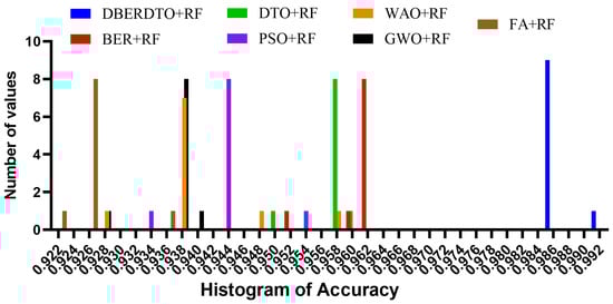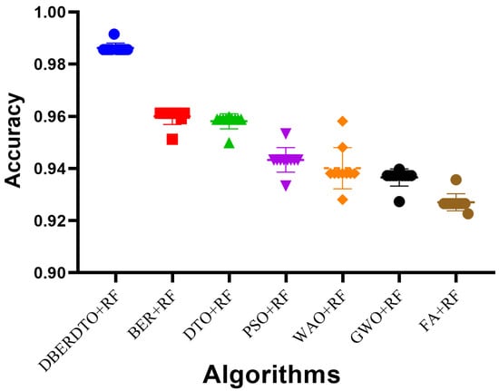 According to the results presented in Table 6, bWAO has the largest average select size (0.776), indicating that it has selected the most features on average. This suggests that bWAO is less efficient at reducing the dimensionality of the dataset, which may result in overfitting. The average fitness results show how each algorithm generally performs. Based on the results, bDBERDTO can be considered a powerful feature selection algorithm for diabetes classification, with an average fitness value of 0.523, which is significantly higher than the other algorithms. The highest fitness values show the greatest results for each algorithm. Based on the findings, bDBERDTO’s feature selection yields superior classification results to the other algorithms, with a best fitness value of 0.425. The lowest fitness values show the worst possible outcomes for each algorithm. Finally, the standard deviation fitness results show the variation in fitness values obtained by each algorithm, revealing that bFA has the worst fitness value of 0.606, indicating that bFA could not select a good subset of features that can perform well in diabetes classification. This suggests that the features chosen by bDBERDTO are more stable and can lead to consistent performance in diabetes classification, as evidenced by the lowest standard deviation of fitness values produced by bDBERDTO (0.346). As a whole, these findings are very suggestive of bDBERDTO’s potential as a feature selection method for diabetes classification.