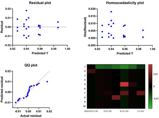 In Figure 5, the residual, homoscedasticity, quartile-quartile (QQ), and heatmap plots are used to examine the ANOVA outcomes of the suggested feature selection technique. Residual and homoscedasticity plots are used to verify that the errors have the same variance and that the data is normally distributed. QQ plots are used to evaluate the normality of the residuals, while heatmap plots are used to see the connections between the chosen features. Providing that the assumptions are met, the residual plot, which displays the discrepancy between the observed and anticipated values, should exhibit no discernible pattern. The homoscedasticity plot’s residuals should be randomly dispersed around the horizontal line to ensure that the error variance is the same across all predictor variables levels. A straight line in the QQ plot indicates properly distributed residuals. We can gain insight into potential multicollinearity issues by displaying highly correlated features in a heatmap. These plots, when combined, give a thorough picture of the ANOVA results of the proposed feature selection approach, allowing practitioners to evaluate the assumptions and see any problems that may need fixing before interpreting the results.