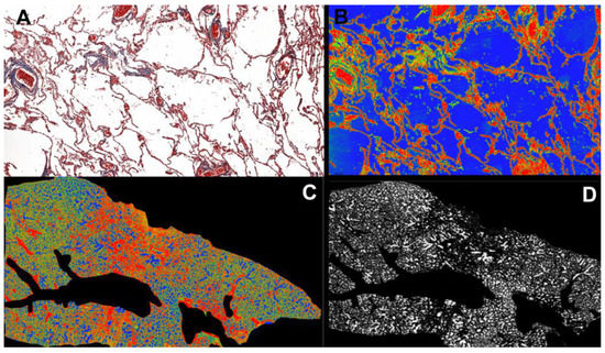 (A). Pulmonary parenchyma in Trichrome Masson stain at 20× magnification. (B). Red Green Blue (RGB) conversion using the Gradient Map Visualisation tool (SlideViewer by 3DHISTECH) highlights alveolar air space in the blue spectrum. (C). Overall view of the pulmonary fragment at 0.5× magnification, in RGB, after cropping vascular spaces using Adobe Photoshop CS9. (D). Pulmonary fragment after RGB stacking using ImageJ/Fiji software (version 2.13.1), highlighting only the free alveolar spaces in a white gradient to measure the total air-filled alveolar percentage of entire lung fragment tissue.