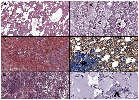 (A) Interstitial pneumonia in an 81-year-old male, H&E at 6× magnification, alveolar walls are thickened by inflammatory infiltrate, congestion is marked, and alveolar spaces are deformed. (B) Thickened eosinophilic hyaline membranes (<) covering the alveolar walls, indicative of organizing phase diffuse alveolar damage (DAD grade 2) in a 69-year-old male, H&E at 10× magnification. (C) Widespread pulmonary infarctions with diffuse hemorrhage in a 77-year-old male, H&E at 5× magnification. (D) Increased fibrosis with damage to lung structure and formation of fibrous bands and proliferative nodules (*) in a 60-year-old male, trichrome Masson, at 20× magnification. (E) Overlapping bronchopneumonia, with abundant neutrophilic infiltrate within alveolar and bronchial space, in an 87-year-old female, H&E at 10× magnification. (F) Recently developed microthrombi, comprised of fibrin and inflammatory cells (^) and alveolar edema in an 84-year-old female, H&E at 20× magnification.