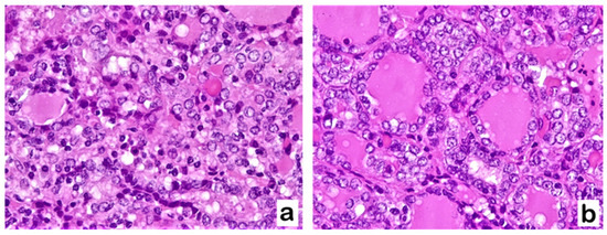 TgAb+/TPOAb− patient with goiter (a) and TgAb+/TPOAb− patient with chronic lymphocytic thyroiditis (b) showing PLNF: thyrocytes are characterized by nuclear enlargement and crowding, nuclear membrane irregularities with grooves, and nuclear clearing with glassy appearance (Hematoxylin–Eosin staining, (a,b): 400×).