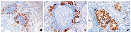 The presence of both PLNF and lymphocytic infiltrate was detected in 21/26 TgAb+ patients (80.8%) and only in 13/44 TgAb− patients (29.5%). Lymphocytic infiltrate was evidenced close to clusters of follicles showing PLNF. It consisted of small, tightly packed lymphocytes, as shown in Figure 2a,b. Germinal centers were sometimes visible [Figure 2c].