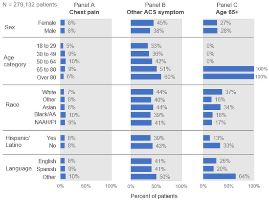 Figure 1 includes the screening characteristics or predictors used to identify those at risk of ACS. The distribution of these characteristics across subgroups of age, sex, race, ethnicity, and language suggests variation in the distribution of risk across the subgroups. Chest pain (Panel A) showed the least variation across the age subgroups. It ranged from 8–10% in most subgroups, although it was markedly lower among the very young (5%, 18–29 years) and the elderly (6%, >80 years). Other ACS-associated symptoms (Panel B) were more prevalent than chest pain in the general population, ranging from 33% to 60% among the subgroups. They were more commonly present among those over the age of 65 (51–60%) and those who spoke neither English nor Spanish (50%).