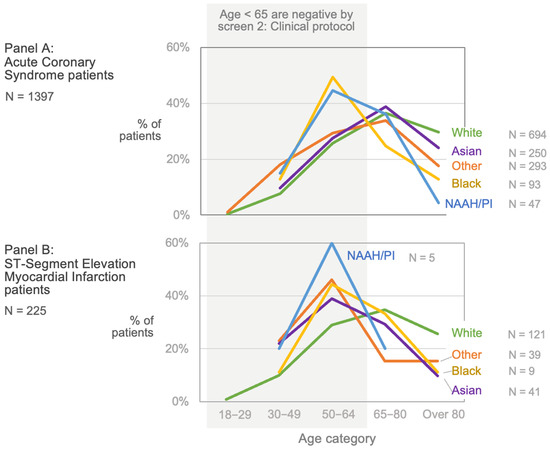 Acute coronary syndrome (ACS) and STEMI patient age by race. Using ‘age >65 years’ as a screening criterion to identify those at risk of ACS introduces substantial inequity. Panel A shows that Black and NAAH/PI ACS patients are generally younger than White, Asian, or other race patients, and many are under age 65. The concentration of cases in the younger age group is even more pronounced among STEMI patients (Panel B), including those of Asian or other race. The sharp cut-off at age 65 for screening inadvertently disadvantages sub-groups with younger age structures, which can fall along racial lines in the US. NAAH/PI = Native American, Alaskan, or Hawaiian/Pacific Islander.