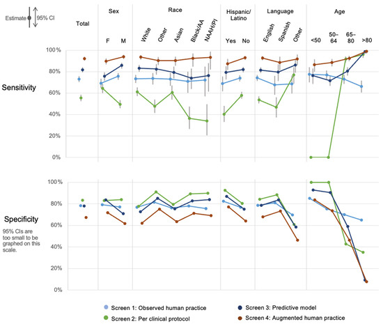 Finally, screening with model-augmented human performance (Screen 4) had the highest sensitivity across all subgroups and screening methods, except for the over-80 subgroup, where it matched the 99% sensitivity of the predictive model. This screen showed little variation by sex, race, or language and most variation by age, ranging from 87% for patients under 50 to 99% for the oldest group. Across most subgroups, however, this consistently high sensitivity is reflected in an approximately 10 percent reduction in specificity (compared to observed human practice) among most subgroups. There were marked reductions in specificity among those over 80 and those who did not speak English or Spanish. Further exploration revealed that this latter population was far older than the average (results not shown) and mostly consisted of Asian language speakers.