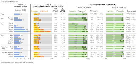 The cohort included 279,132 ED patients, of whom 1397 had a final hospital diagnosis of ACS. Of those with ACS, 225 had a final diagnosis of STEMI (Table 1). Compared to the total population of patients, those with ACS and STEMI were older, more often male, more often White or Asian, and less often Hispanic/Latino (columns D and G in Table 1). The highest rates for ACS and STEMI per 10,000 patients were observed among patients over 65, men, and non-Hispanic/Latino patients (Table 1).