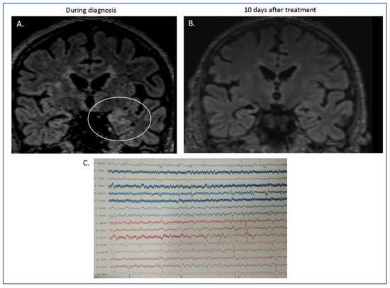 (A,B) MRI features of our case report with autoimmune limbic encephalitis after COVID-19 infection. During his stay in hospital, the initial MRI showed increased signal in the flair sequences in coronal sections of the left hippocampus ((A) flair, ellipse showing the maximum hyperintensity in left temporal lobe). These abnormalities were absent after immunotherapy, when our patient had recovered completely ((B) flair sequences). (C) Electroencephalogram (EEG). Electroencephalogram was performed during disease initiation. Diagram showing absence of basal rhythm with frequent recording of low-potential bradyarrhythmia, predominantly in the right hemisphere. Sparse recording of epileptiform discharges localized in the left frontotemporal areas.
