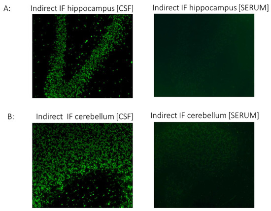CSF but not serum analysis showed strong IgG binding in brain sections. Specifically, immunostaining in cerebellar and hippocampal sections displayed a strong positive signal in the granular layers of the cerebellum and neurons of the hippocampus (Figure 2). Although the antigenic epitopes are unknown, intense staining indicates high specificity to specific neuronal proteins.