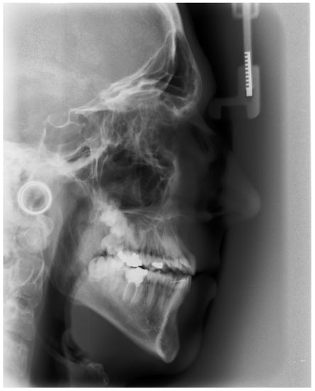 An example of a cephalometric radiograph of a patient from the study group presenting characteristic features of the craniofacial morphology is presented in Figure 2. A protrusion of the upper incisors is visible as a compensation for the sagittal skeletal discrepancy. The lower incisors are steep.