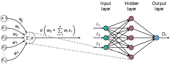 Anatomy of a feedforward artificial neural network. Illustration of a one-layer fully-connected network (FCN) architecture. The network consists of an input layer with three units, exemplified here by age, smoking status, and left ventricle ejection fraction. Hidden neurons receive inputs, compute weighted sums, and pass through nonlinear activation functions to produce outputs. The network maps process data to output units, providing probabilities of class membership or estimating numeric quantities of interest. The primary objective of this architecture is to learn complex nonlinear mappings between input and ground-truth data.