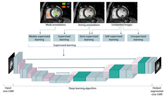 Most DL approaches for medical image analysis are based on convolutional neural networks (CNNs). CNNs are a DL algorithm designed to analyze visual data such as images and videos. They consist of multiple layers of interconnected artificial neurons known as convolutional layers. These layers employ filters to process input data, effectively capturing spatial relationships and patterns. The filters execute convolutions by sliding across the input data, multiplying values, and generating feature maps that emphasize significant features. For detection, localization, and segmentation tasks, one of the most popular CNN-based architectures is the U-Net [31]. The U-Net architecture (and its variants) consists of a U-shaped structure comprising two interconnected paths. The contracting path enables the extraction of increasingly abstract, fine-grained features while preserving both local and global contextual information. This is achieved through a series of downsampling operations that progressively reduce the spatial resolution of the image. On the other hand, the expanding path involves upsampling the image back to its original spatial resolution by utilizing skip connections. These connections establish direct links between corresponding blocks at the same hierarchical level, facilitating the integration of high-resolution features. This U-shaped architecture allows for effective information flow and combines local details with a global context, making it suitable for various image analysis tasks. For instance, a U-Net could be trained to identify and segment the left atrium for the automated quantification of left atrium volume in routine long-axis cardiac cine images. Likewise, U-Nets can be used for image quality enhancement, where the network learns to denoise corrupted images. For such tasks, a training set comprised of corrupted–uncorrupted image pairs is required to train the model. After pixel-wise alignment, the model is learned by minimizing the error function between the input and network-generated images. While this approach would be ideal, acquiring such real pixel-aligned image pairs in routine clinical practice is difficult for various reasons, including pixel misalignment due to motion artifacts [12]. Semi and self-supervised learning approaches have the potential to overcome these limitations thanks to their ability to make the most out of unlabeled data.
