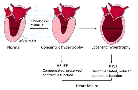 Cardiac hypertrophy is a physiological adaptive response of the heart to maintain cardiac function against physiological or pathological cardiac overloading that is characterized by an increased cardiomyocyte size and heart mass [1]. However, sustained pathological stress can lead to pathological cardiac hypertrophy (PCH), which manifests as enlarged cardiomyocyte size, cardiac fibrosis, and cardiomyocyte death [1,2]. As the disease progresses, pathological hypertrophy changes from the reduction in ventricular chamber dimension with increased wall thickness to the ventricular chamber dilatation in the later stages, progressively leading to heart failure (Figure 1) [3]. A better understanding of the key molecules in PCH may allow early diagnosis and targeted therapy.