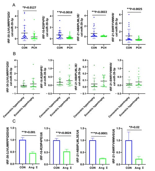 Validation of the relative expression level of downregulated tsRNAs by real-time qPCR. The plasma of 35 PCH patients and 25 controls were used for validation. The statistical significance between PCH and controls was calculated by the Student t-test. Data were expressed as the means ± SD. (A) The relative expression of the 4 down-regulated tsRNAs between PCH and CON. The blue dots mean expressions of CON, the green dots mean expressions of PCH. (B) The relative expression of the 4 downregulated tsRNAs between concentric hypertrophy and eccentric hypertrophy. p < 0.05 was considered statistically significant. The dark green dots mean expressions of CON, the light green dots mean expressions of PCH. (C) The relative expression of 4 down-regulated tsRNAs between the control H9c2 group and the Ang II-stimulated H9c2 group (n = 3). p < 0.05 was considered statistically significant. * p < 0.05, ** p < 0.01, *** p < 0.001. CON: control; PCH: pathological cardiac hypertrophy.