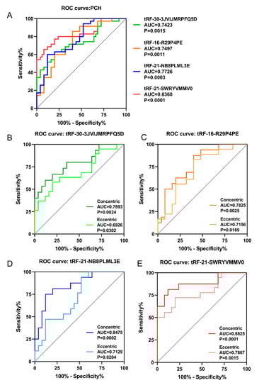 To analyze the early-stage screening potential of the differentially expressed tsRNAs in PCH, ROC curves were generated for the four tsRNAs in concentric hypertrophy and eccentric hypertrophy (Figure 4B–E), and the AUC, p-value, sensitivity, and specificity values were analyzed (Table S3). The ROC curve results showed that the early-stage screening potential of the four tsRNAs was better than that of the late stage, and tRF-21-SWRYVMMV0 and tRF-21-NB8PLML3E showed good diagnostic potential in the entire course of PCH.
