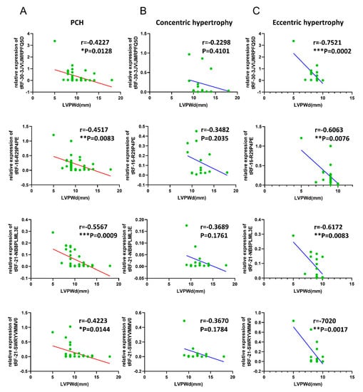 Correlations of validated tsRNAs expression with LVPWd in PCH patients. Spearman’s analysis was applied to test the correlation of validated tsRNAs expression with disease activity. (A) Correlations of the 4 downregulated tsRNAs expression with LVPWd in PCH (n = 35); (B): Correlations of the four downregulated tsRNAs expressions with LVPWd in concentric hypertrophy (n = 16); (C): Correlations of the four downregulated tsRNAs expressions with LVPWd in eccentric hypertrophy (n = 19). p < 0.05 was considered statistically significant. * p < 0.05, ** p < 0.01, *** p < 0.001. LVPWd: left ventricular posterior wall dimensions. PCH: pathological cardiac hypertrophy.