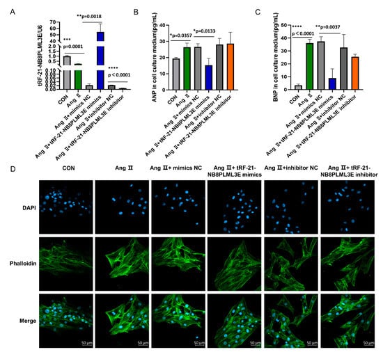 The results showed that tRF-21-NB8PLML3E expression in the mimic- or inhibitor-transfected group was significantly higher and lower, respectively than that in the control group (Figure 6A, p < 0.01), indicating an effective transfection. As shown in Figure 6B,C, the levels of ANP and BNP were significantly decreased in tRF-21-NB8PLML3E mimic-transfected cells. The fluorescence results (Figure 6D) showed that the tRF-21-NB8PLML3E mimic treatment was able to alleviate Ang II-induced cardiomyocyte hypertrophy.