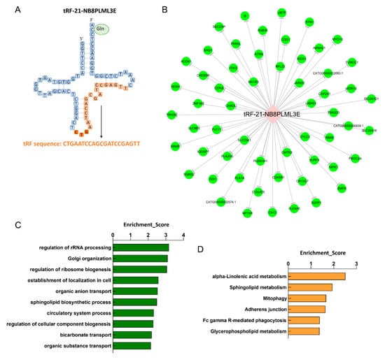Integrated analysis of validated tsRNAs. (A) Sequence information for tRF-21-NB8PLML3E. (B) The potentially altered target mRNAs of tRF-21-NB8PLML3E. (C) The gene ontology (GO) enrichment analyses of tRF-21-NB8PLML3E. (D) KEGG pathway analysis for tRF-21-NB8PLML3E gathering genes. The vertical axis shows the annotated functions of the target genes. The horizontal axis shows the enrichment score (−log10 transformed p-value), respectively. Only the most significantly enriched clusters are included.