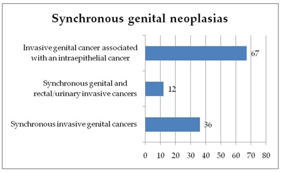 From these 7419 cases, we selected patients diagnosed with synchronous primary invasive cancers. We identified 36 patients with invasive SGN, representing 0.49% of the total population, and 12 patients that presented with a primary gynecological neoplasia synchronous with another pelvic primary invasive cancer (rectal or urinary bladder)—0.17%. We also identified 67 cases presenting with an invasive form of gynecological neoplasia and an intraepithelial cancer of another organ of the feminine genital tract—0.9%. Figure 1 presents the incidence of the synchronous genital cancers in our study group.