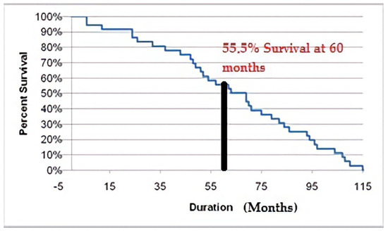 Non-linear analysis of survival over time—55.5% 5-year survival rate in study group.