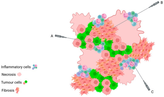 Figure 2. Schematic depicting intratumoural heterogeneity, with areas of necrosis, fibrosis, and inflammation admixed amongst tumour cells. Despite sampling from the same tumour mass, Core Biopsy A will sample an area of almost pure tumour cells; Core Biopsy B will sample background stromal and necro inflammatory cells only; Core Biopsy C will sample a mix of inflammatory cells and tumour cells. This highlights the importance of taking multiple core biopsies in order to ensure that the tumour cells are adequately sampled for assessment.