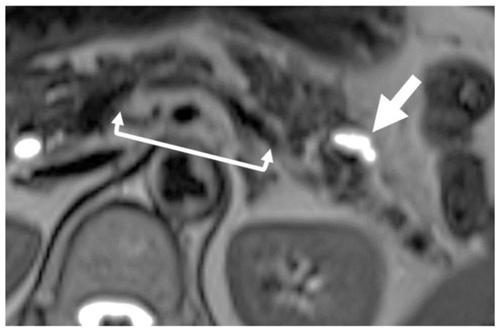 FPPA is a secondary finding suggesting HGP/CIS that can be recognized on MRI or CT [36,37,38,41,42]. FPPA presents as an irregularly shaped focal defect in the pancreatic parenchyma, which can be recognized as an indentation of the parenchyma on CT or MRI (Figure 1) [35,36] showing asymmetric changes concerning the MPD. According to the shape, FPPA is classified into three types: cave-in, slimness, and slit [35]. The cave-in type presents as a focal indentation of the pancreatic surface; the slimness type as longitudinal but focal atrophy of the pancreatic parenchyma with a shaggy appearance; and the slit type as a cuneiform defect of the pancreatic parenchyma.