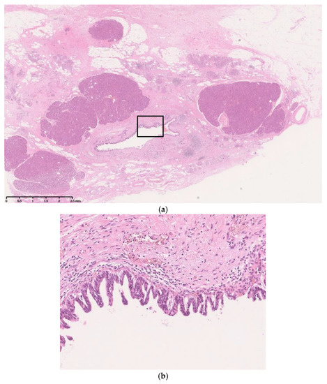 Histopathology of focal pancreatic parenchymal atrophy (FPPA). (a) FPPA consists of replaced adipose tissue. The margin of the area is sharp and clear, and the surrounding pancreatic parenchyma shows no significant changes, such as inflammatory cell infiltration, fibrosis, or atrophy (hematoxylin–eosin, ×40). (b) FPPA is observed around or adjacent to the pancreatic duct with neoplastic changes in the pancreatic ductal epithelium (square part of a) (hematoxylin–eosin, ×200).
