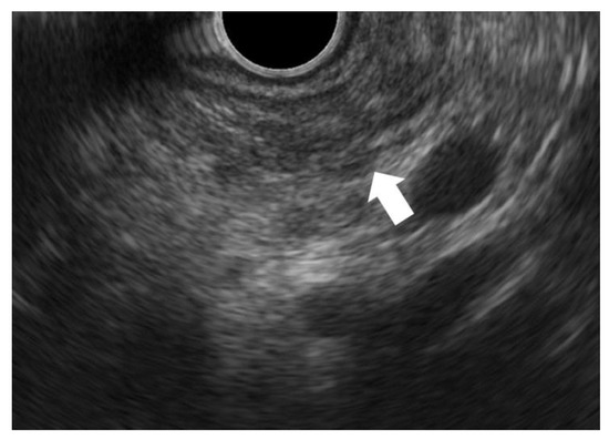 FPPA can be observed on EUS as a blurred hypoechoic area (Figure 3) [22,45]. The pancreatic parenchyma is hyperechoic. If the parenchyma is atrophied and the area is replaced by fibrosis and fat, echogenicity is lost, and the area becomes hypoechoic. However, this area is not clearly demarcated and can be blurred. In some cases, fibrosis related to HGP/CIS strictures the MPD and shows an MPD stricture surrounded by hypoecho, which is known as a hypoechoic stricture [22].