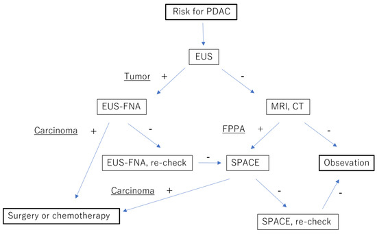 High-risk factors for PDAC, such as a familial history of PDAC, pancreatic cystic lesions, and elderly-onset diabetes mellitus, are well known [47]. Patients at risk of PDAC are candidates for pancreatic examination. The strategy considered efficient for diagnosing early-stage PDAC is shown in Figure 5.