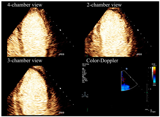 Stress echocardiography aims to detect myocardial ischemia by observing the transient changes in regional function that occur during stress. Specifically, the presence of coronary obstruction leads to reduced blood flow in the sub-endocardial region, resulting in decreased wall thickening and endocardial excursion in the ischemic areas. Stress echocardiography is performed using either exercise or pharmacologic stressors (dobutamine or vasodilator drugs) to induce myocardial ischemia. Furthermore, SE offers relevant information regarding coronary microvascular function, heart valves, or myocardium [5,6,7,8,9,10]. This imaging modality is limited in the case of poor acoustic windows. In that case, the application of ultrasound contrast media determines better the endocardial border delineation, allowing a precise assessment of wall thickening and excursion [11,12] (Figure 1).