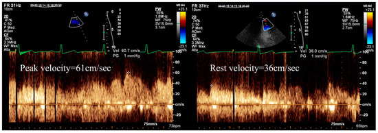 Calculation of Doppler CFVR-LAD during stress echocardiography, demonstrating reduced stress (left) to rest (right) peak diastolic velocity ratio (*61/36 = 1.7; normal value > 2.0), suggesting significant, probably obstructive, CAD in the left anterior descending artery.