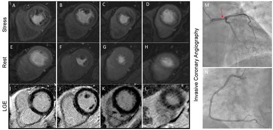 Stress perfusion CMR performed on a 63-year-old man with multiple cardiovascular risk factors and symptomatic for shortness of breath during moderate physical efforts. Panels (A–D) show the presence of diffuse hypoperfusion during regadenoson infusion that is not present during the rest phase (Panel (E–H). Since no scar is detected in LGE sequences (Panel (I–L)), the stress perfusion CMR concluded for large perfusion defects, which was confirmed by invasive coronary angiography. A severe stenosis of the Left Main Steam (Panel (M), red arrowed) was found. Panel (N) is showing right coronary artery, which has no critical stenosis.