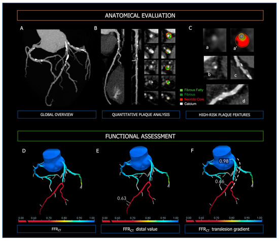 Anatomical evaluation and functional assessment of coronary plaques derived from CCTA. Panel (A)—3-vessel overview of the coronary tree for evaluation of calcium extent and distribution; Panel (B)—curved MPR, straight MPR, and cross-sections for quantitative plaque analysis; Panel (C)—high-risk plaque features; (a,a’): low attenuated plaque; (b): napkin-ring sign; (c): positive remodeling; (d): spotty calcifications. In the upper Panels, the figure legend refers to the colors used for quantitative plaque analysis; light green: fibrous fatty volume; dark green: fibrous volume; red: necrotic core volume; white: calcific volume. Panel (D): FFR-CT 3D model of the coronary tree, with distal FFR-CT (Panel (E)) and trans-lesion gradient (Panel (F), dashed line). At the bottom of Panels (D–F), the colorimetric scale of FFR-CT used in the 3D models is shown.
