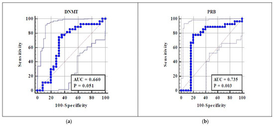 ROC curve of (a) DNMT1 expression and (b) PR-B methylation as predictors of endometriosis with an LBW history. The ROC curve is depicted as a blue line, and its standard error is depicted as the black line.