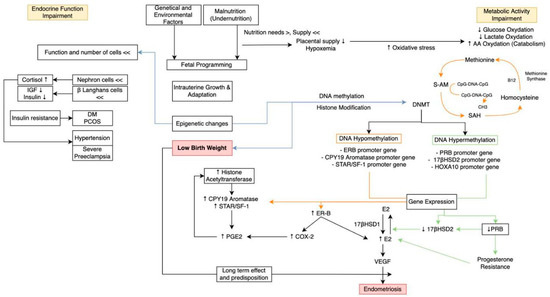 Pathomechanism of endometriosis through the “Malnutrition—Fetal Programming—Epigenetic—Low Birth Weight” pathway.