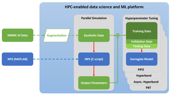 This paper describes the process by which an ML and data science platform that takes advantage of Modular Supercomputing Architecture (MSA) available from the Jülich Supercomputing Centre (JSC) is used to build a surrogate model of the NPS with the intention of implementing it for streamlined ARDS-diagnosis support [28,29,30]. In order to achieve this primary goal, several steps need to be completed as follows: