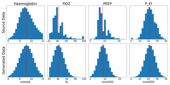 The data used in this research were collected from the open-source Medical Information Mart for Intensive Care - III (MIMIC-III) database as part of the research done by Sharafutdinov et al. also within the scope of the SMITH project [42,43,44]. Due to the limited number of patients and the inconsistent representation of their parameters, it was decided to generate simulated data based the statistical distribution of the original data extracted from the MIMIC-III database. In order to perform this data augmentation, the statistical distribution of each parameter listed in Table 2 is analysed and a generator is developed that outputs randomised snapshots of patient states emulating a wide range of real-world parameter combinations. The choice of these parameters was based on the input parameters required for proper functioning of the NPS. Matching the parameters from the simulation to their equivalent values in the MIMIC-III database was done by Sharafutdinov et al. in previous work [43,44]. Table 3 provides a statistical description of the data extracted from the source dataset while Figure 2 presents a comparison of the distributions of the source data and the generated data. In this case, the minimum and maximum cutoff values were chosen based on discussions with clinicians.