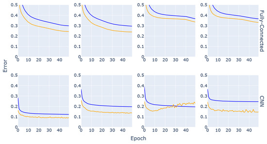 Training (blue) and validation (orange) MAE for several neural networks built either using the fully connected architecture or as CNNs.