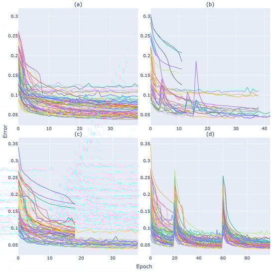 The results of the DL model training step of this research highlighted the inherent differences between a fully connected (i.e., traditional Artificial Neural Network (ANN)) architecture and a convolution-based approach. While ANNs are more likely to give value to every input parameter, CNNs are more adapted to uncover connections between the inputs and infer meaning from them, which might explain why these networks consistently performed better. The results in Figure 3 show that CNNs might overfit the data if the layers are not well tuned, but in most cases the performance surpassed that of ANNs and lower MAE values were reached in shorter training periods, which ultimately makes the convolutional approach more resource-efficient. Additionally, the curves consistently show the validation error being lower than the training error; this is due to the regularisation and dropout layers introduced in the network architectures to reduce overfitting. These layers are active during the training process but inactive by design during validation and testing (https://keras.io/getting_started/faq/ (accessed 10 February 2023)).