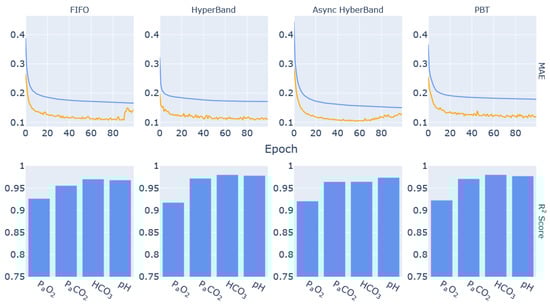 The results from each parameter combination listed in Table 5 are presented in Figure 5. The learning curves for the networks trained on the parameters from the FIFO and the Asynchronous HyperBand trials both show some overfitting towards the second half of the training process. This is also reflected in the R2 score graphs for the output parameters, where it can be seen that prediction performance for PaCO2, bicarbonate concentration and pH is reduced compared to the networks from the HyperBand and PBT trials. Additionally, the R2 score graphs show that PaO2 prediction accuracy is consistently lower than the remaining output parameters, although still above 0.90.