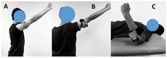 Assessment of shoulder proprioception in (A) Flexion; (B) abduction; and (C) medial and lateral rotations.