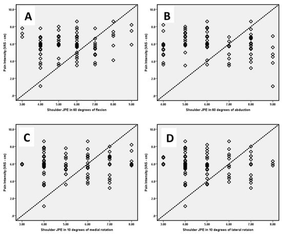 Correlation between pain intensity and shoulder joint position errors (JPE) in (A) 60° of flexion; (B) 60° of abduction; (C) 10° of medial rotation; and (D) 10° of lateral rotation.